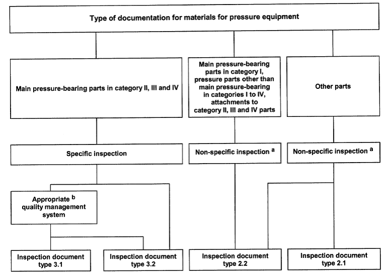 According to EN 10204:2004, the types of inspection documents for materials of various components of pressure equipment.