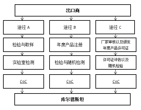根據(jù)途徑 A,即將裝運(yùn)的管制產(chǎn)品必須經(jīng)過合規(guī)驗(yàn)證及物理檢驗(yàn),以證明符合庫爾德斯坦相關(guān)標(biāo)準(zhǔn)及必需的要求。 認(rèn)證流程如下: