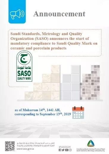 陶瓷產(chǎn)品于2019年9月13日起必須獲得沙特質(zhì)量標(biāo)志QM認(rèn)證