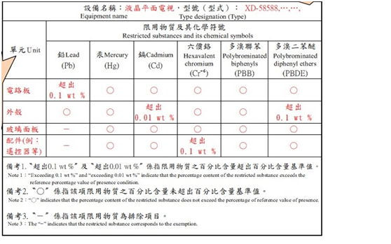 歐盟RoHS禁止含有有害物質(zhì)的電子電氣產(chǎn)品投放到市場上,而臺灣的規(guī)定則有所不同,即使產(chǎn)品的限用物質(zhì)含量超過限值,仍被允許投放到市場上。然而,申請者必須將 “限用物質(zhì)含有情況表”(參見下圖)標示于電子電氣產(chǎn)品的本體、包裝、標簽或說明書上。