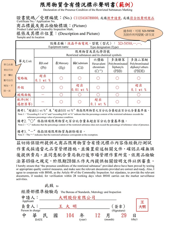 申報書須經(jīng)申請人簽名并蓋章,確保受影響產(chǎn)品的限用物質(zhì)存在表格內(nèi)容正確,并有檢測報告或通過相應(yīng)的質(zhì)量管理措施。