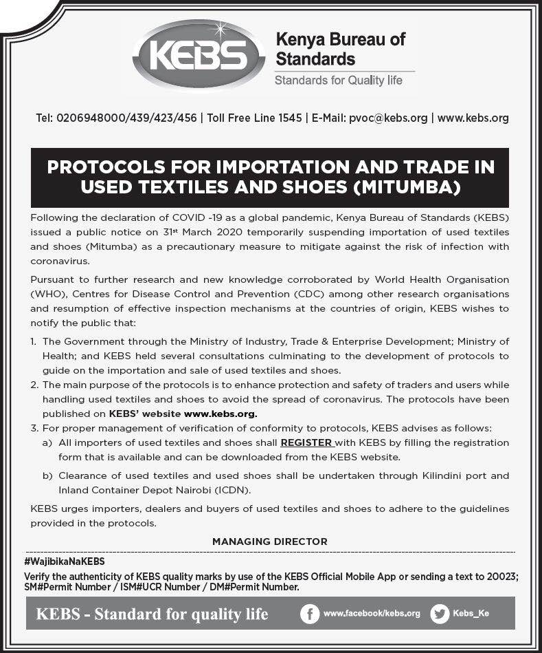 近日,肯尼亞標(biāo)準(zhǔn)局Kenya Bureau Of Standards (KEBS) 頒布,肯尼亞將恢復(fù)二手服裝與二手鞋類產(chǎn)品的進(jìn)口與銷售,同時(shí)KEBS已制定新協(xié)議進(jìn)行規(guī)范與指導(dǎo)。該協(xié)議的主要目的為加強(qiáng)對(duì)貿(mào)易商與消費(fèi)者/ 使用者的保護(hù)與安全,避免疫情的傳播。該協(xié)議已發(fā)布在KEBS官方網(wǎng)站。