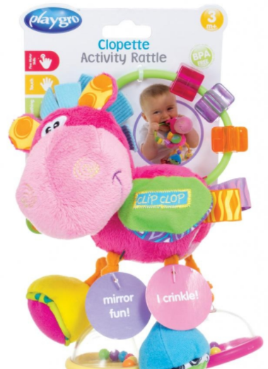 此次召回產(chǎn)品為Playgro的Clip Clop撥浪鼓玩具。產(chǎn)品為藍(lán)色毛絨小馬造型,四條腿中2條作為撥浪鼓、1條腿上有鏡子,馬背上有算盤(pán)和3顆珠子。側(cè)面標(biāo)簽上印有“Clip Clop”;縫合處的標(biāo)簽上印有批號(hào)010053、010082;產(chǎn)品包裝上印有UPC 9321104011459。