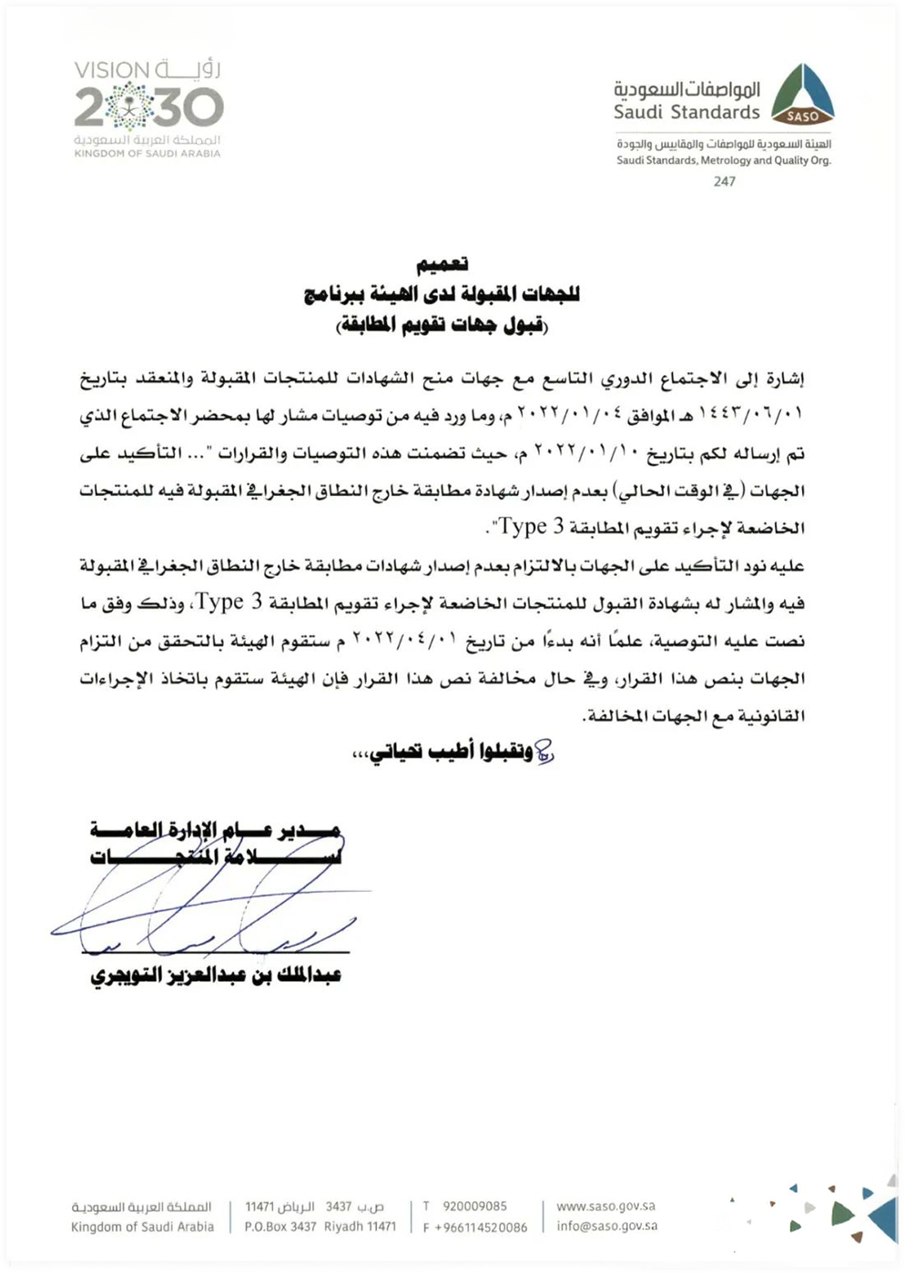 Certification Bodies are forbidden to issue a Product Certificate to the Type 3 products outside the acceptable geographic range started from Apr. 1st, 2022. The SASO authority will verify whether there is a violation of this decision among all the Certification Bodies, and it will take legal measures to the violating parties.