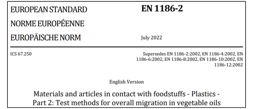 新版EN 1186-2:2022:將測試“橄欖油中總遷移量”的原六項2002版標準EN 1186-2、1186-4、1186-6、1186-8、1186-10和1186-12整合為一個標準。