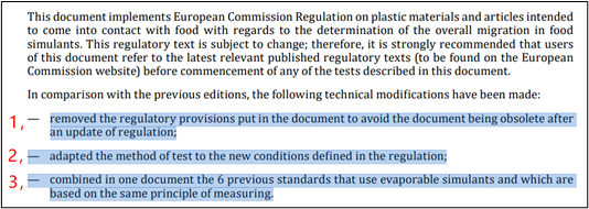 根據(EU)No. 10/2011及其修正案article 12 第2條及article 17第4條的規(guī)定的新條件,為滿足關于所有遷移試驗類型測試結果表達方式的要求,兩項標準都調整了測試方法,并增加了相應的結果表述。