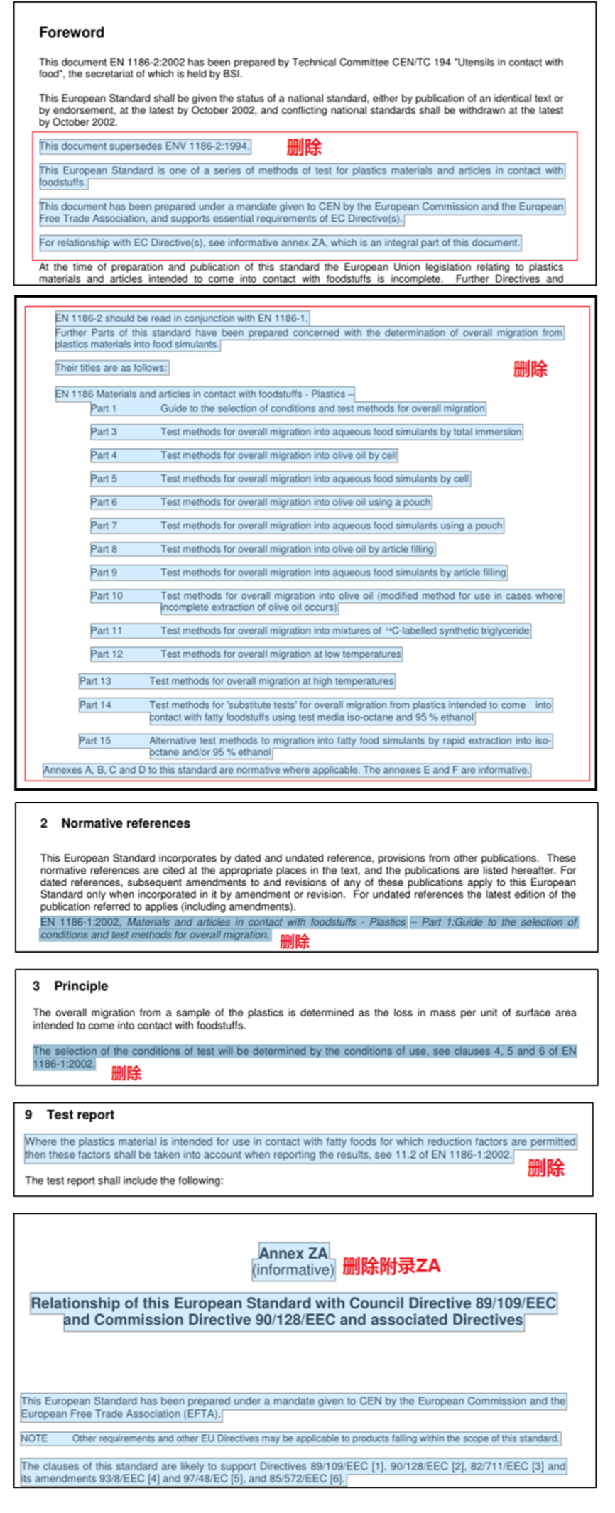 刪除了2002版標準中前言、第二章、第三章及文中測試步驟、測試報告中對EN 1186-1:2002的引用,同時也刪除了原標準附錄ZA及相關引用,以避免相關法規(guī)更新后導致標準的失效。