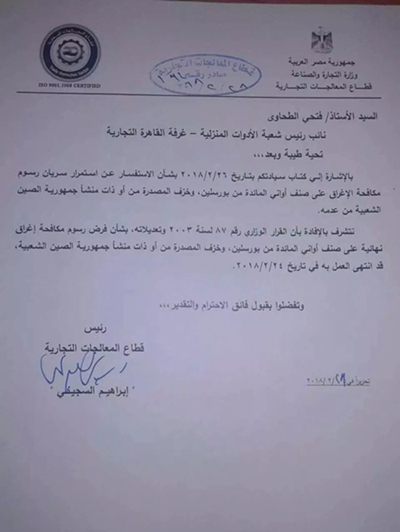 由于埃及進口商進口的陶瓷餐具在市場售賣價格高于埃及本國工廠生產(chǎn)的陶瓷餐具,這導(dǎo)致大部分進口商產(chǎn)品滯銷,最后不得不向政府發(fā)文訴苦,隨后政府部門相繼作出以下回復(fù)文章: