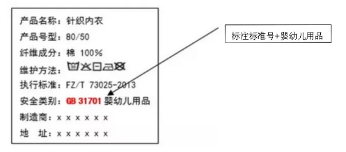 ●釋義:GB 31701 要求的標(biāo)注方式與 GB 18401  有所不同。GB 18401 只標(biāo)明類別即可,但 GB 31701  要求應(yīng)標(biāo)注標(biāo)準(zhǔn)編號。此處必須引起高度關(guān)注,以免沿用了舊標(biāo)準(zhǔn)的做法。
