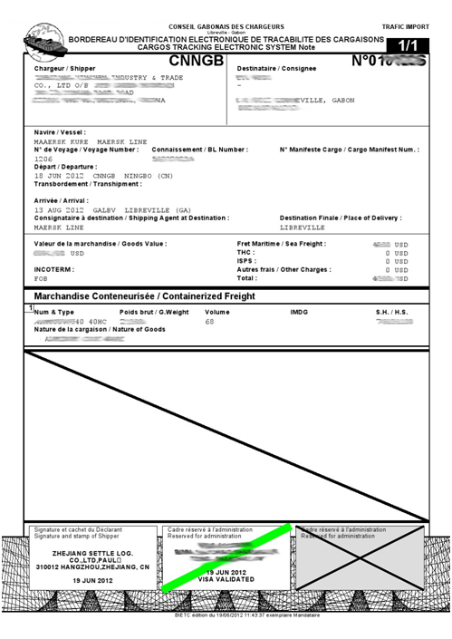 1)跟蹤單必須在貨物裝貨前或裝貨時預(yù)先申請,跟蹤單必須在裝貨后不遲于5個工作日內(nèi)完成所有程序,包括:收到全數(shù)的申請費用(申請費用根據(jù)柜型柜量或者裝運方式有所不同,請詢問在線客服具體的費用標(biāo)準(zhǔn)),提供所需要的文件及資料以便制作草本跟蹤單,確認(rèn)草本跟蹤單,簽發(fā)正本。如超過以上時間,我方必須請示加蓬有關(guān)當(dāng)局方能確定是否能接收申請。